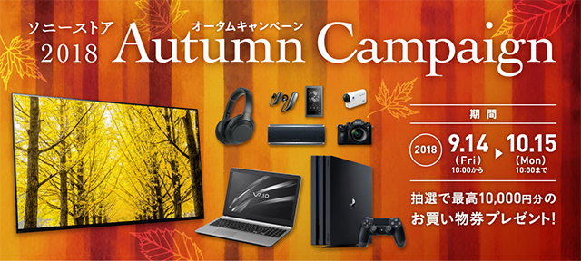 ・最高10,000円分のお買物券が当たる「ソニーストア 2018オータムキャンペーン」、9月14日(金)~ 10月15日(月)まで開催。