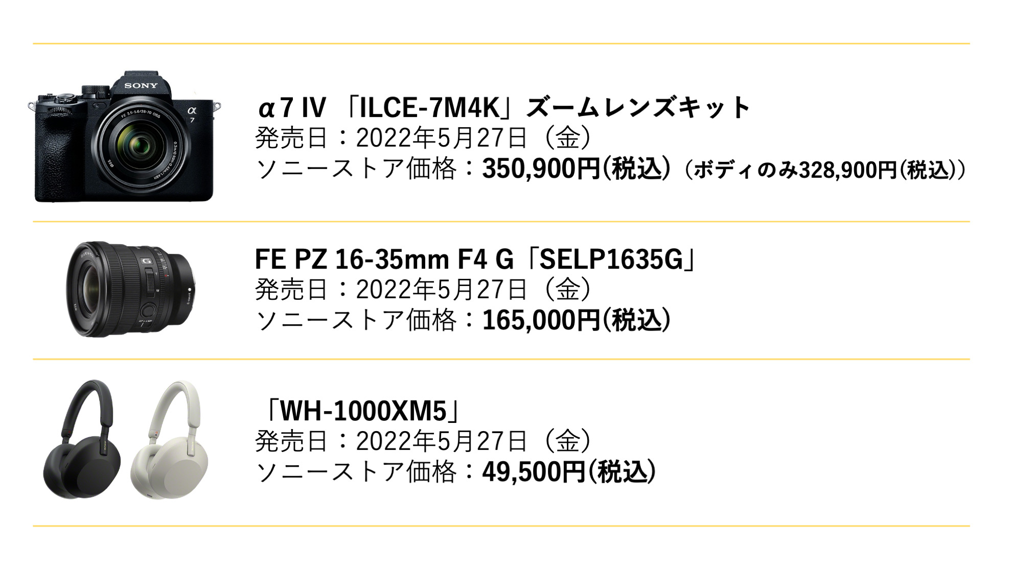 2022年5月27日(金)、α7 IV 「ILCE-7M4K」ズームレンズキット、FE PZ 16-35mm F4 G「SELP1635G」、ノイズキャンセリングヘッドセット「WH-1000XM5」発売。ソニーストアでは、現時点で全モデル在庫あり。