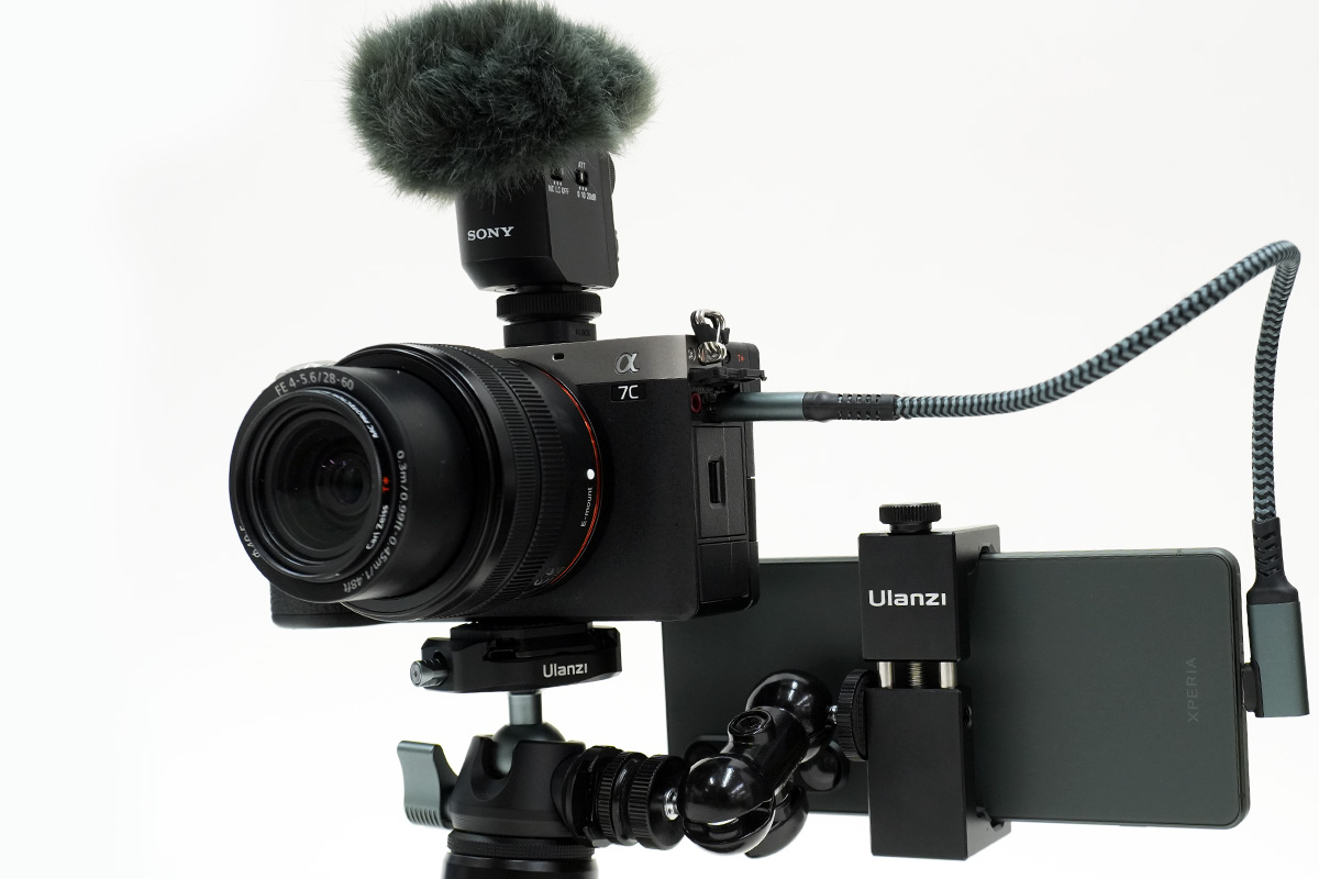 カメラ用の大型マイクを接続すれば、より音声品質も上げることができる(ただし装備過多になる点には注意)