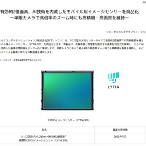 ソニーセミコンダクタソリューションズ株式会社は、1/1.12型の大判センサーサイズで有効約2億画素の高解像度を備えたモバイル用イメージセンサー『LYTIA 901』を11月に商品化、2025年11月下旬に量産出荷することを発表。