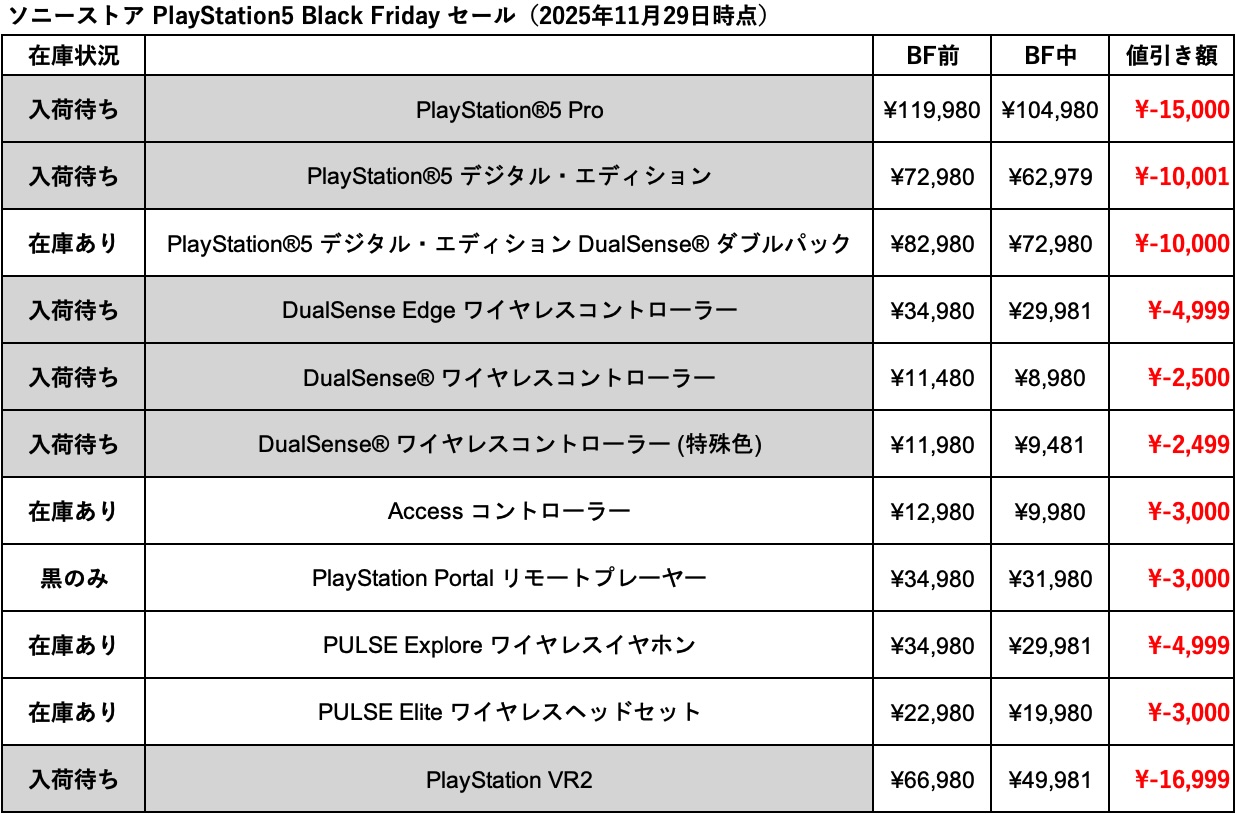 ソニーストアでも2025年11月21日より始まったプレイステーションブラックフライデーセールについて、あっという間に在庫切れで購入できない状態となってしまった。