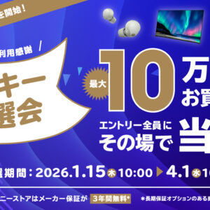 ソニーストア直営店(銀座・札幌・名古屋・大阪・福岡天神、オンライン)では、「ソニーストアご利用感謝 ラッキー抽選会」を2026年1月15日(木)10:00~2026年4月1日(水)10:00までの期間限定で開催。