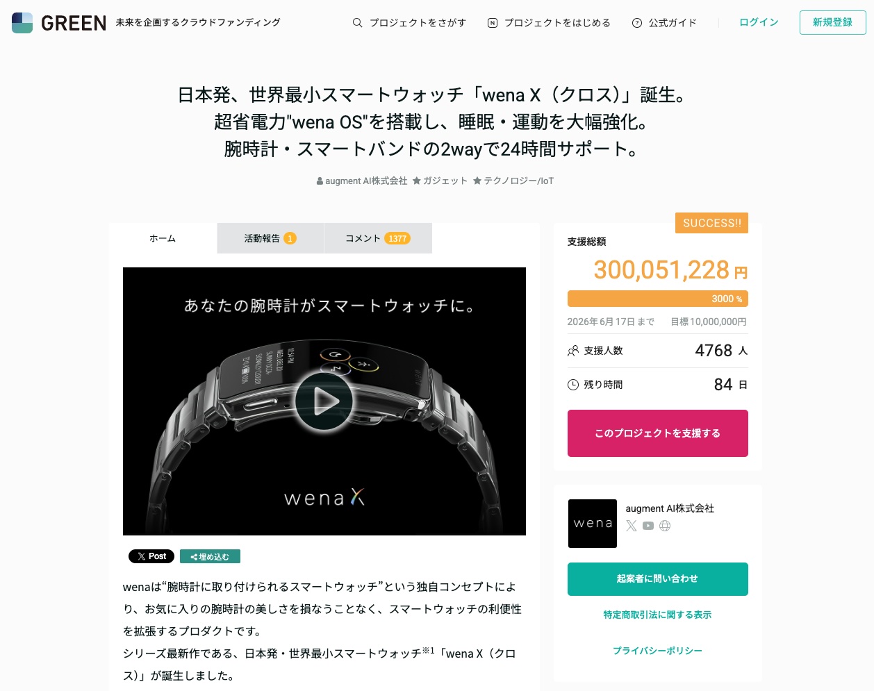 スマートウォッチ「wena X」(ウェナ クロス)、支援総額3億円を突破!