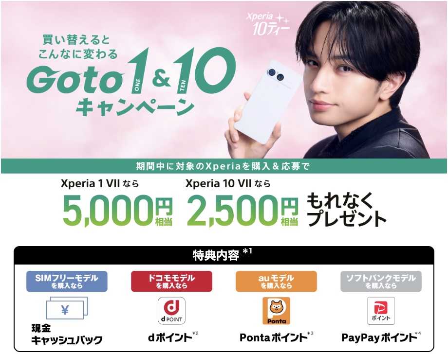 Xperia 1 VII(5,000円)、Xperia 10 VII(2,500円)対象のキャッシュバックキャンペーン開催!「買い替えるとこんなに変わる! Go to 1 & 10 キャンペーン」