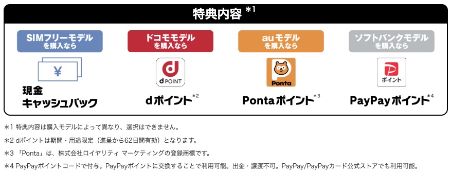 販売モデルによってプレゼントされる形式も異なっていて、SIMフリーモデルでは現金キャッシュバック。