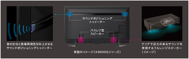 大画面モデルの「X8550Gシリーズ」のみ2つのサウンドポジショニングトゥイーターと2つのフルレンジスピーカーを備える音響技術「アコースティック マルチ オーディオ」を備えている。
