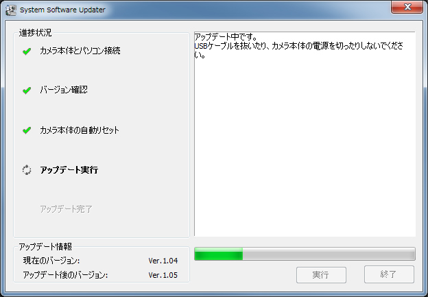 アップデートが完了した後は、カメラ本体が再起動して背面液晶に再び表示されれば終了。