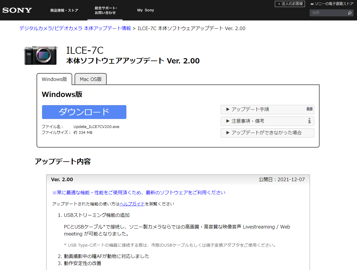 ・ILCE-7C 本体ソフトウェアアップデート (Windows) Ver. 2.00