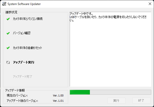 アップデートが完了した後は、カメラ本体が再起動して背面液晶に再び表示されれば終了。