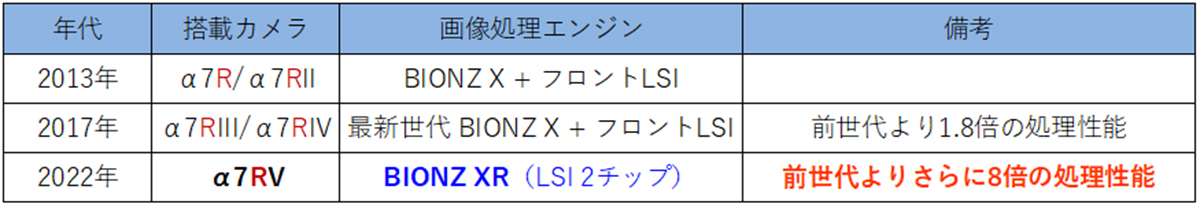 「α7R IV」は、画像処理エンジン「BIONZ X」とフロントエンドLSIを連携して処理していたものから、「α7R V」では最新型の画像処理エンジン「BIONZ XR」になった。