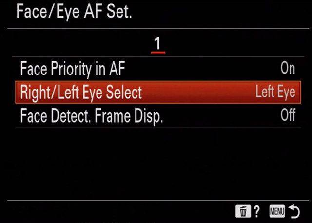 瞳をの検出を「オート」「右目」「左目」から設定でき、「右目/左目切替機能」をカスタムボタンに設定することで撮影中でもボタンを押して瞳AFの左右を切り替えることができる。