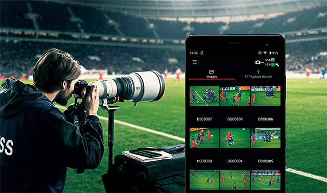 デジタル一眼カメラα9のFTPバックグラウンド転送を使用して、静止画の全画像または選択した画像を撮影中でもモバイル機器に転送可能。