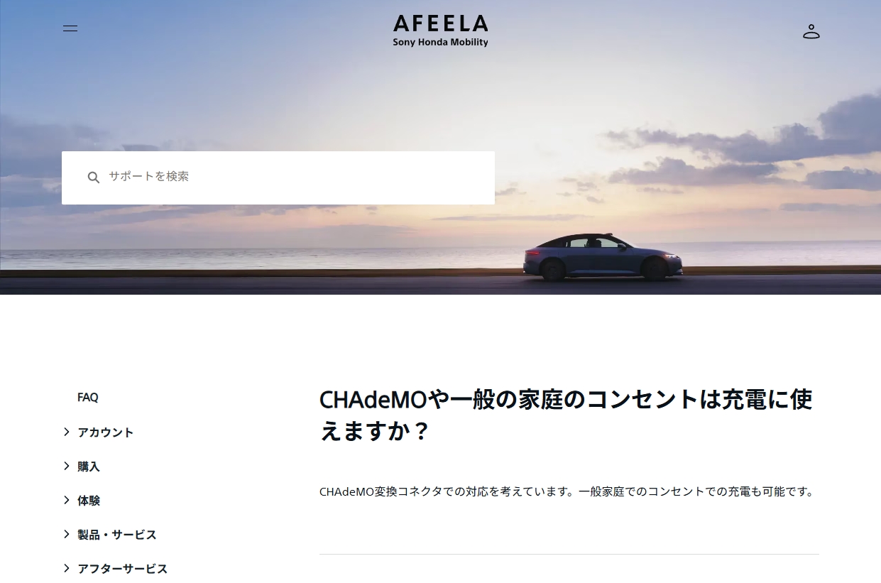NACS採用のソニーEV「AFEELA」は、純正CHAdeMO変換コネクタを発売するのか?ソニーホンダモビリティ公式サイトFAQ情報。