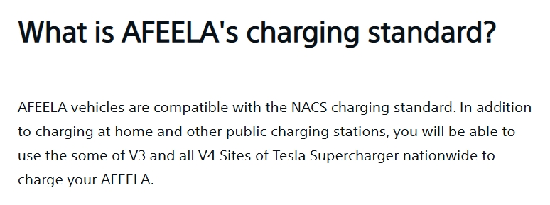 AFEELA vehicles are compatible with the NACS charging standard. In addition to charging at home and other public charging stations, you will be able to use the some of V3 and all V4 Sites of Tesla Supercharger nationwide to charge your AFEELA.