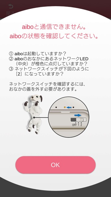 目の前にうろうろしてる“aibo”のネットワークLEDがオレンジ色に光ってることも、スイッチが[2]になってることも確認してるのに、なんでや( ゚д゚ )クワッ!!