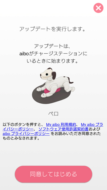 「My aibo」アプリから[アップデートを開始]。規約を読んだら[同意してはじめる]をポチ。