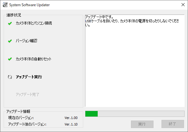 アップデートが完了した後は、カメラ本体が再起動して背面液晶に再び表示されれば終了。