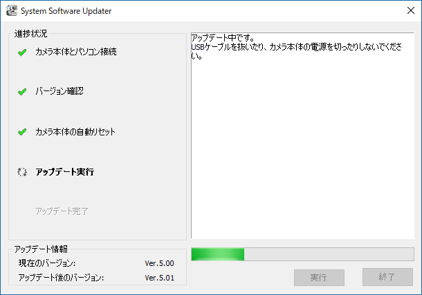 アップデートが完了した後は、カメラ本体が再起動して背面液晶に再び表示されれば終了。