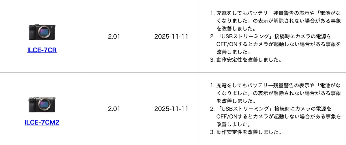 デジタル一眼カメラα7CR「ILCE-7CR」Ver.2.01、α7C II「ILCE-7CM2」Ver.2.01 本体ソフトウェアアップデート。バッテリー表示改善、USBストリーミング時の動作改善、動作安定性の改善を実施。