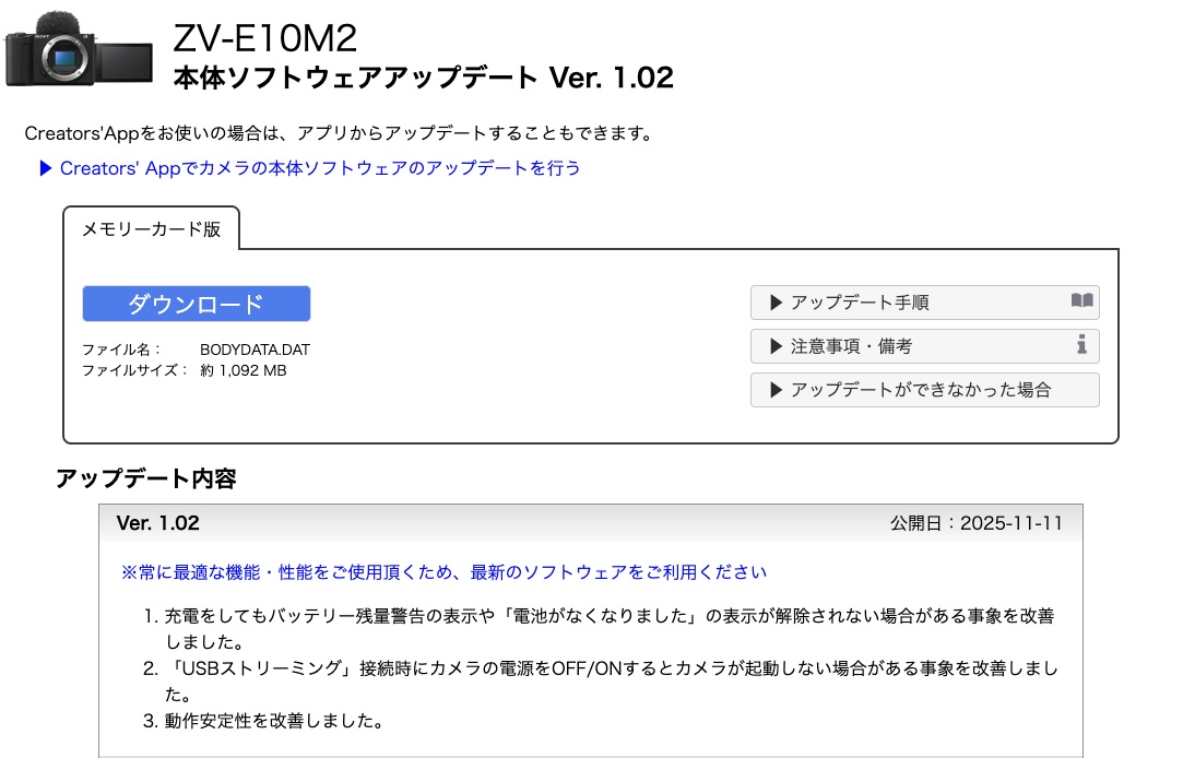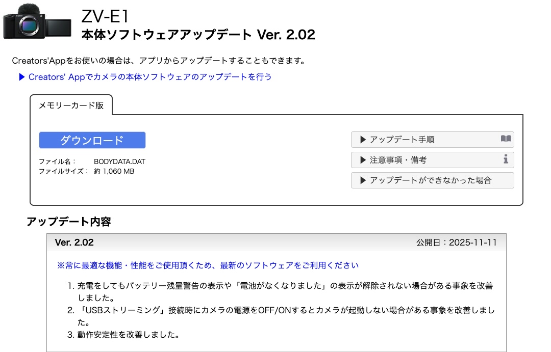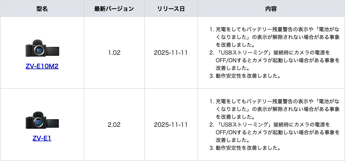 今回は、ZV-E1はVer.2.02、ZV-E10 IIはVer.1.02にバージョンアップ。