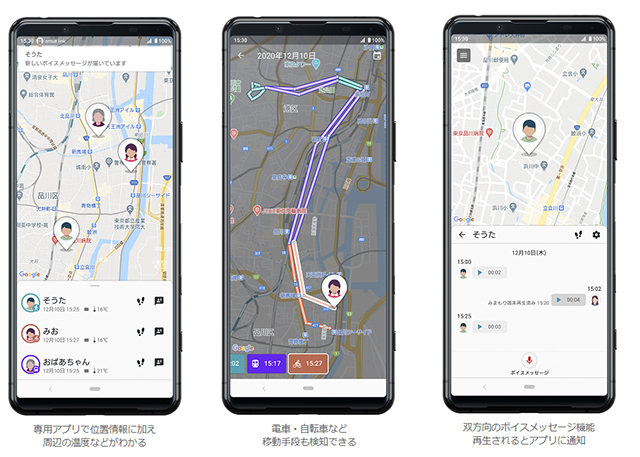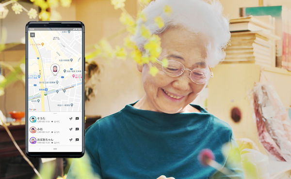 子どもが 「LM-01」 を持ち歩くと、親は端末から発信される情報をスマートフォンの専用アプリで確認することができる。