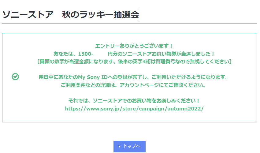 ・当選するお買い物券の金額はその場で分かりますが、ご利用いただけるのは翌日からです(アカウントページでご自身のMy Sony IDに登録されたのをご確認ください)。