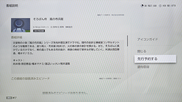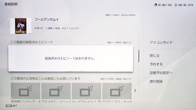 「新作ドラマ・アニメガイド」から気になる番組を選んでみると、番組詳細があって右ペインから「予約」、「詳細予約設定」、「語句登録」ができるといのは、今までのブルーレイディスクレコーダーと似た感じ。