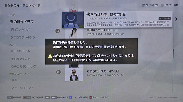 それから、新ブルーレイディスクレコーダーに備わった新作のドラマやアニメを、最長1か月前から先行予約できる新機能「新作ドラマ・アニメガイド」