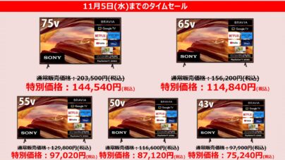 ブラビア TV・レコーダー SONY 4K液晶テレビ ブラビア BRAVIA X75WLシリーズ全モデル【75~43型】、ソニーストアのタイムセールで最大38,500円大幅値下げ!クーポンやお買い物券併用で55型までは10万円以下で購入も可能。2025年11月5日(水)まで。 2025.10.30