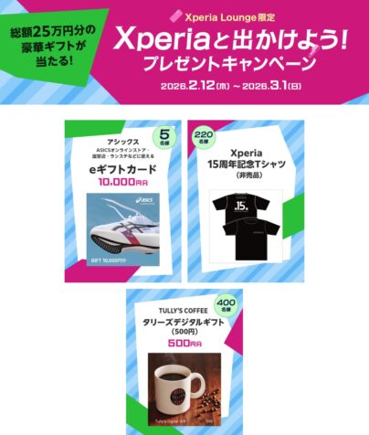 XPERIA Xperiaユーザー向け「Xperiaと出かけよう!プレゼントキャンペーン」を2026年3月1日(日)まで開催。総額25万円分ギフトの他、Xperia15周年記念Tシャツを220名様にプレゼントなど。 2026.02.12