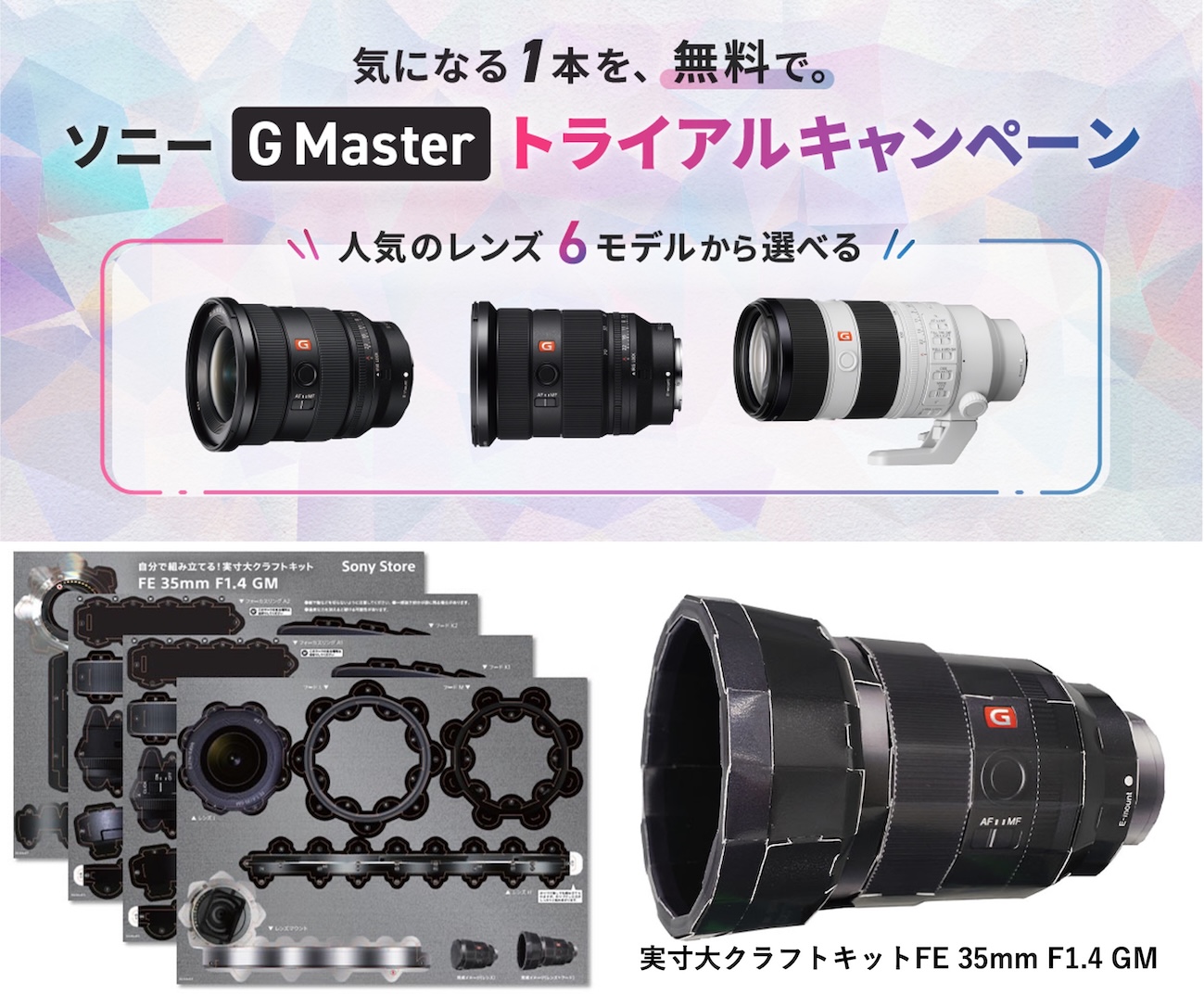 ソニーαレンズ無料トライアルキャンペーン開催。Gマスターレンズ6本を無料レンタル、応募で「実寸大クラフトキットFE 35mm F1.4 GM SEL35F14GM」店舗プレゼント。
