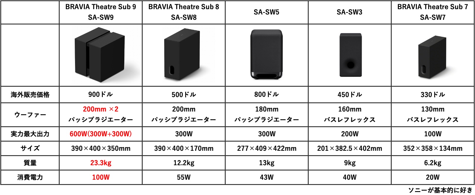 型番に”9″が使われていたり、プレミアムワイヤレスサブウーファーを呼ばれていることから、フラグシップ級のモデルであることがわかる。