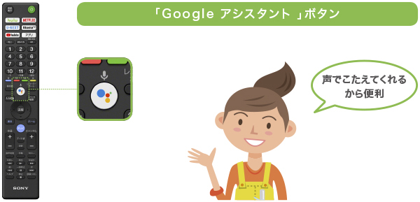 リモコンの「 Google アシスタント 」ボタンを押して、見たい映画や、好きな俳優など、気になるワードを話しかけるだけで、youtubeやアプリから音声検索できる。