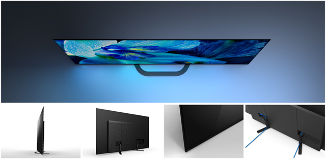 「A1 /A9Fシリーズ」のような立てかけたデザインではなく、テーブルトップ設置時の奥行が約255mm(77型は30.2mm)と設置場所を選ばないデザインとなり、壁によりそった壁掛けスタイルが可能に。