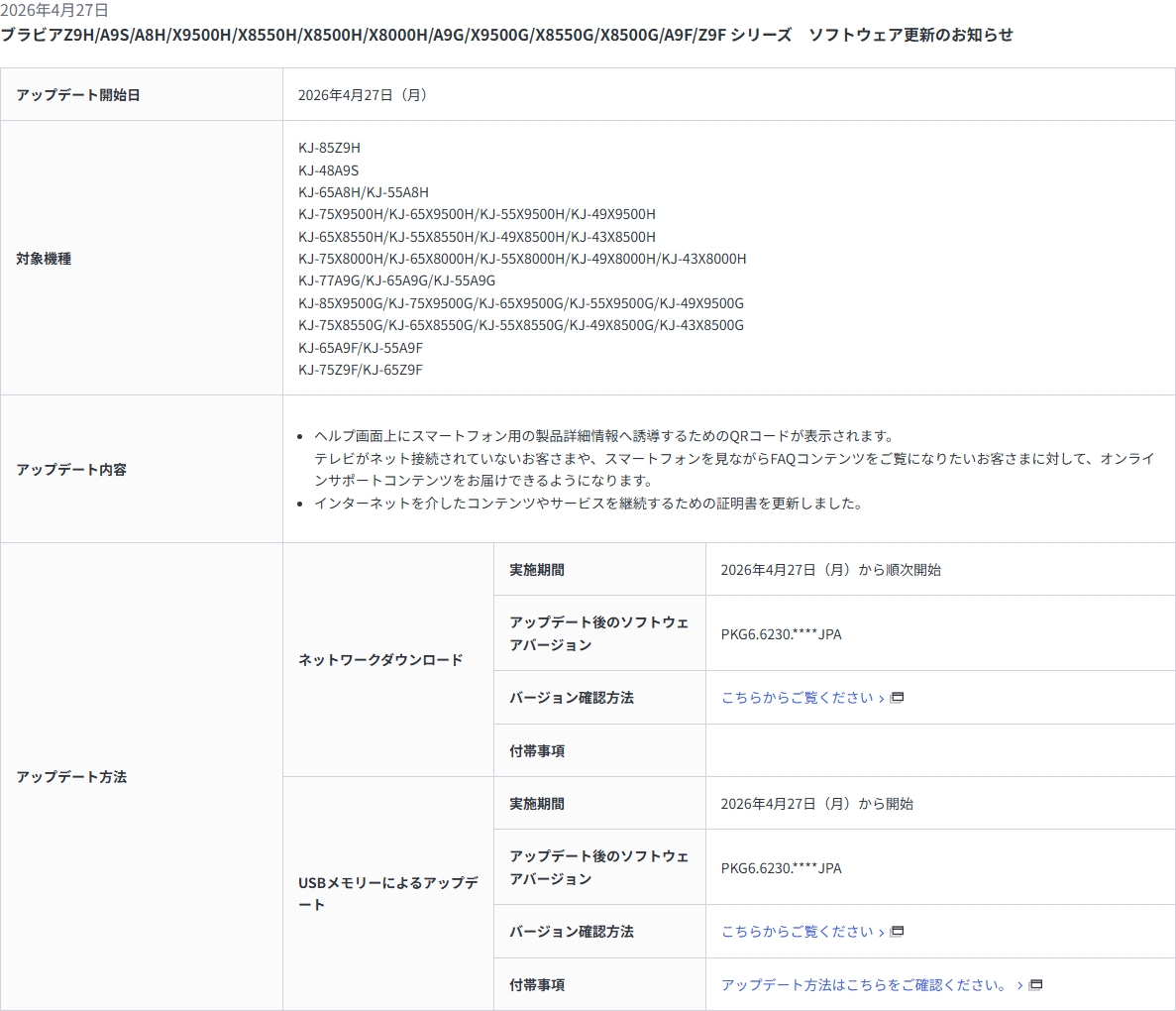 2026年4月27日(月)に、BRAVIA 2018年〜2020年のモデルについて、ヘルプ画面上にスマートフォン向けQRコードの表示や、インターネットを介したコンテンツやサービスを継続するための証明書の更新を目的とした本体ソフトウェアアップデートの配信を開始。
