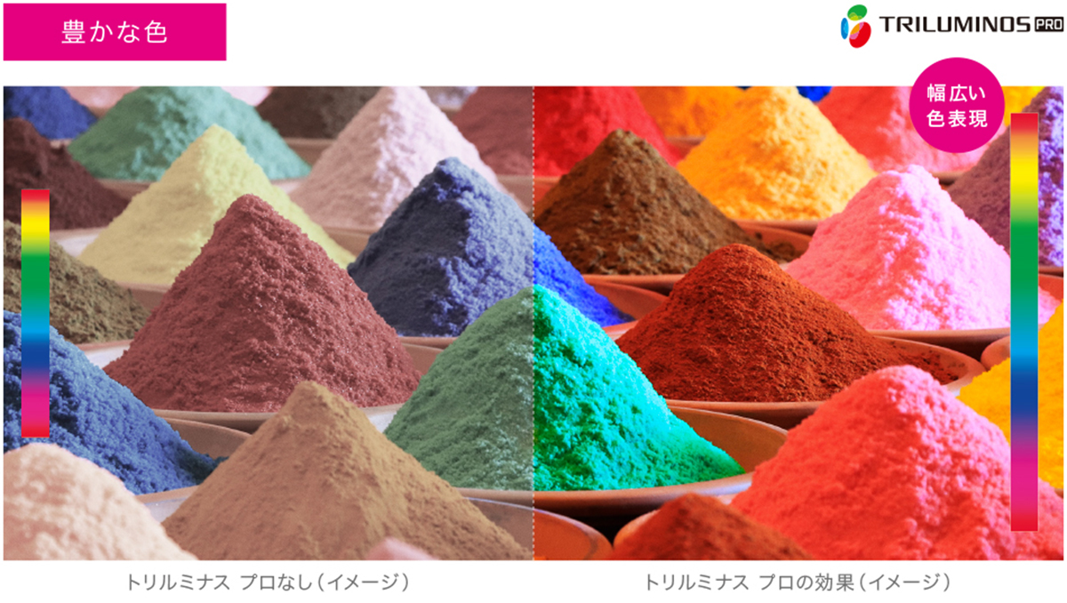 「トリルミナス プロ」では、広い色再現領域に加えて、独自の新アルゴリズムにより、彩度/色相/明度を3次元で検出することで、より細部まで忠実な色を自然に再現することが可能。