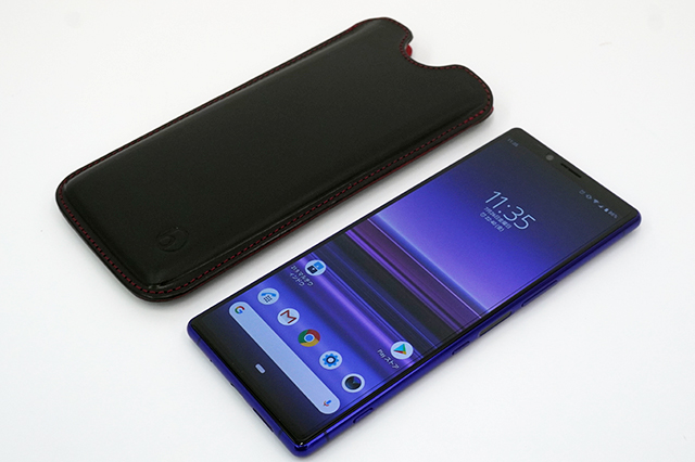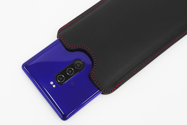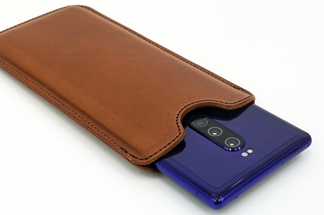 「Xperia 1 」をレザーケースに入れると、程よい抵抗を感じながら、本体がレザーケースの内側にあるクロスに触れながら収まっていく。