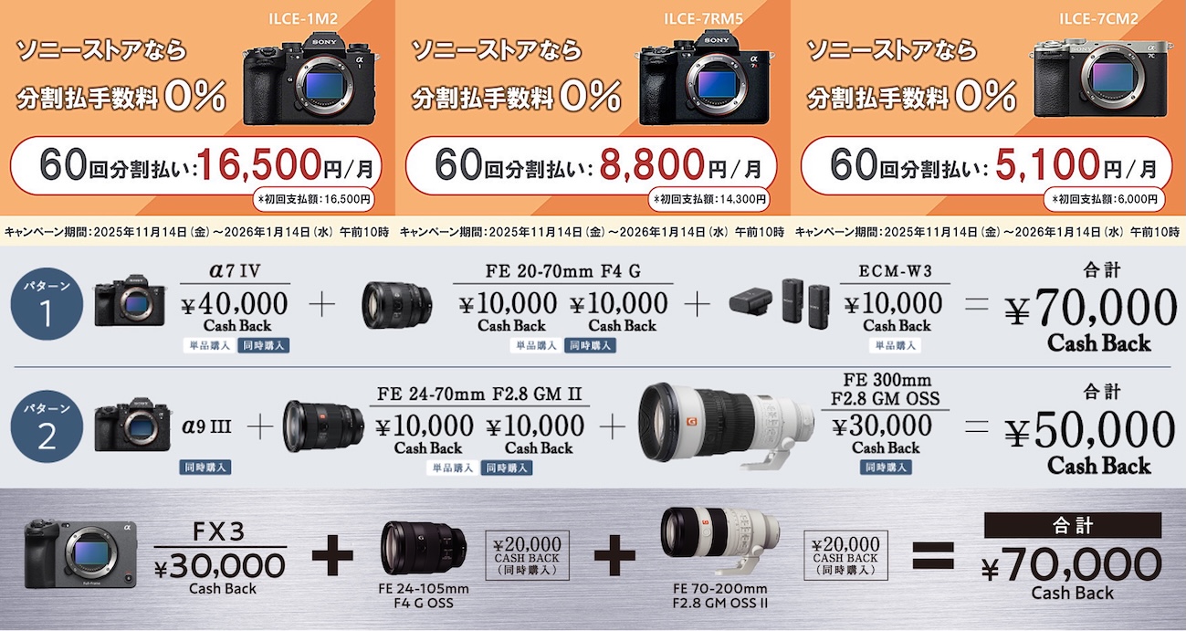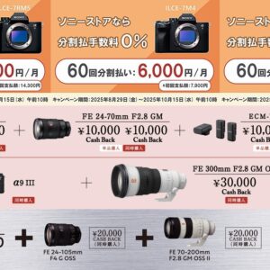 ソニーストアでは、大型のキャッシュバックキャンペーン「αウィンターキャッシュバックキャンペーン2025」、「Cinema Line ウィンターキャッシュバックキャンペーン2025」にあわせて、デジタル一眼カメラα ボディ・レンズを対象にした「分割払い60回まで金利手数料0%キャンペーン」を開始。