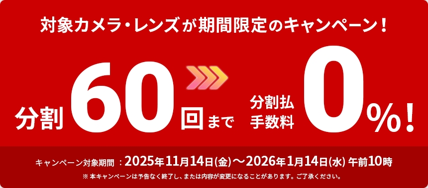 「分割払い60回まで金利手数料0%キャンペーン」の対象となったカメラボディ・レンズは、一部キャッシュバックキャンペーンが行なわれている。