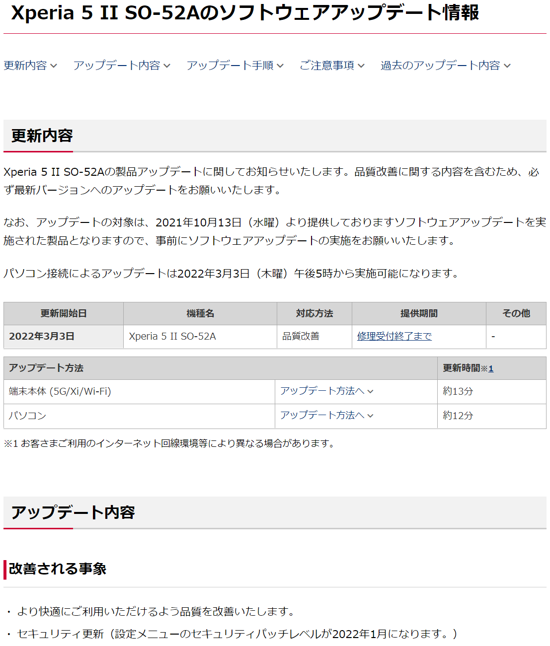 NTT ドコモ Xperia 1 II (SO-51A)、Xperia 5 II (SO-52A)にソフトウェアアップデート。品質改善と、セキュリティパッチレベル2022年1月更新。(2022年3月3日)