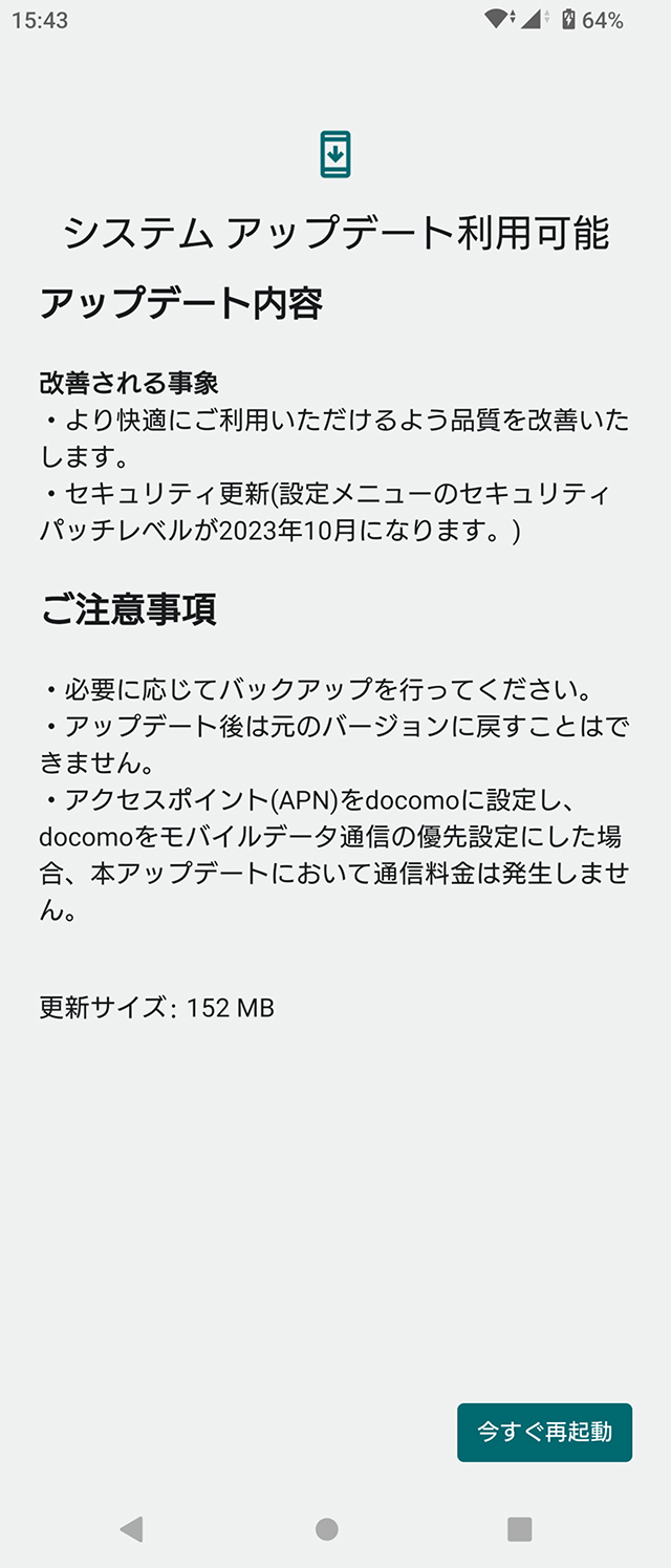 ドコモのアップデート内容は、より快適に利用できるよう品質を改善、セキュリティパッチレベルが2023年10月となるセキュリティ更新が含まれている。