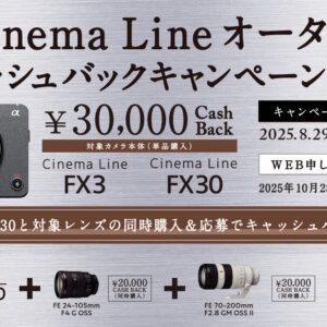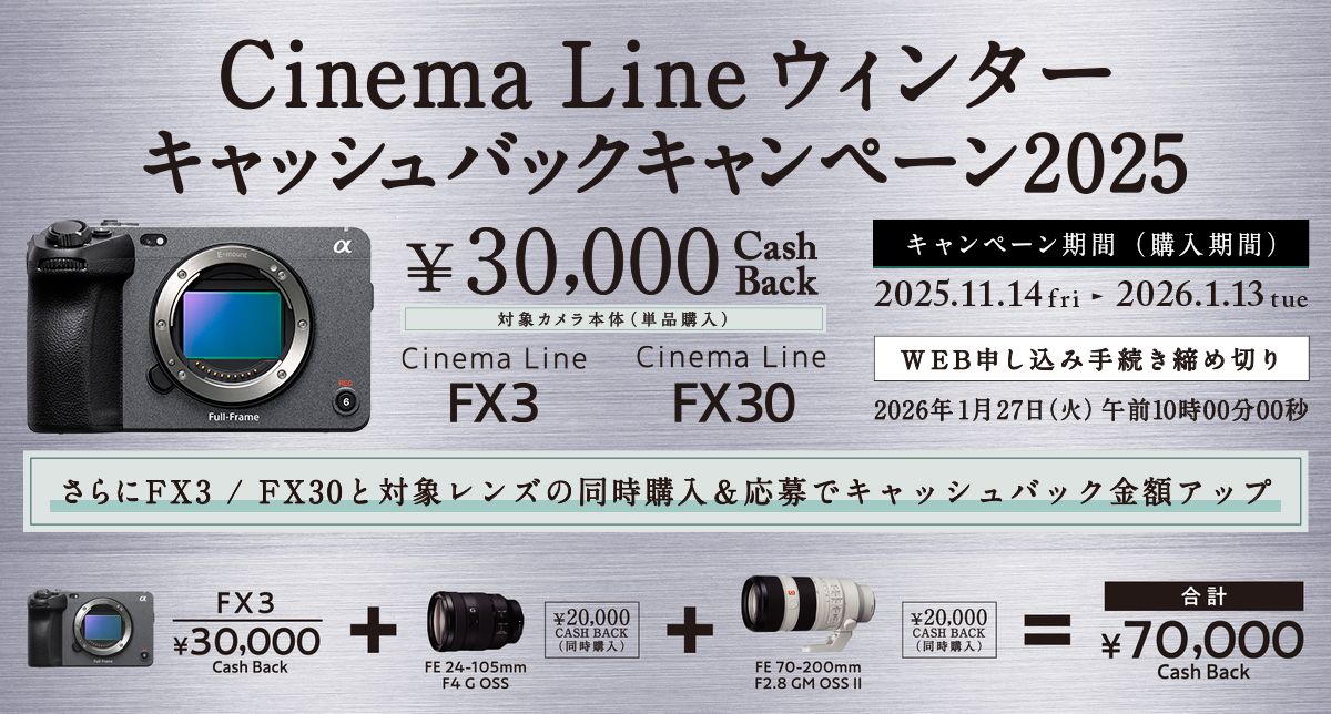 「Cinema Line ウィンターキャッシュバックキャンペーン2025」2025年11月14日より開催。FX3/FX30 3万円、同時購入αレンズ 最大2万円。