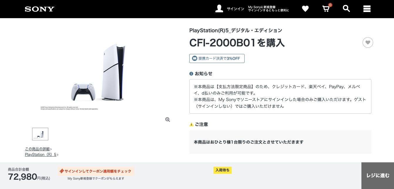 新型番と関連しているかは不明だけれど、ソニーストアで販売していたPlayStation5 デジタル・エディション CFI-2000B01の在庫が無くなり入荷待ちで、購入できない状態となっている。