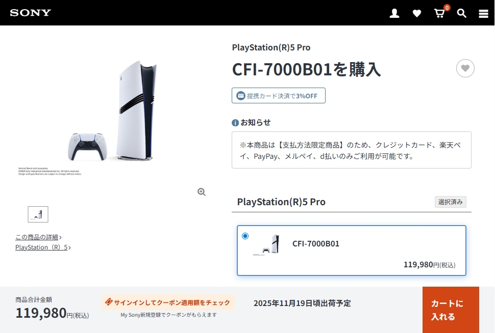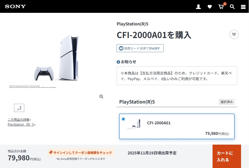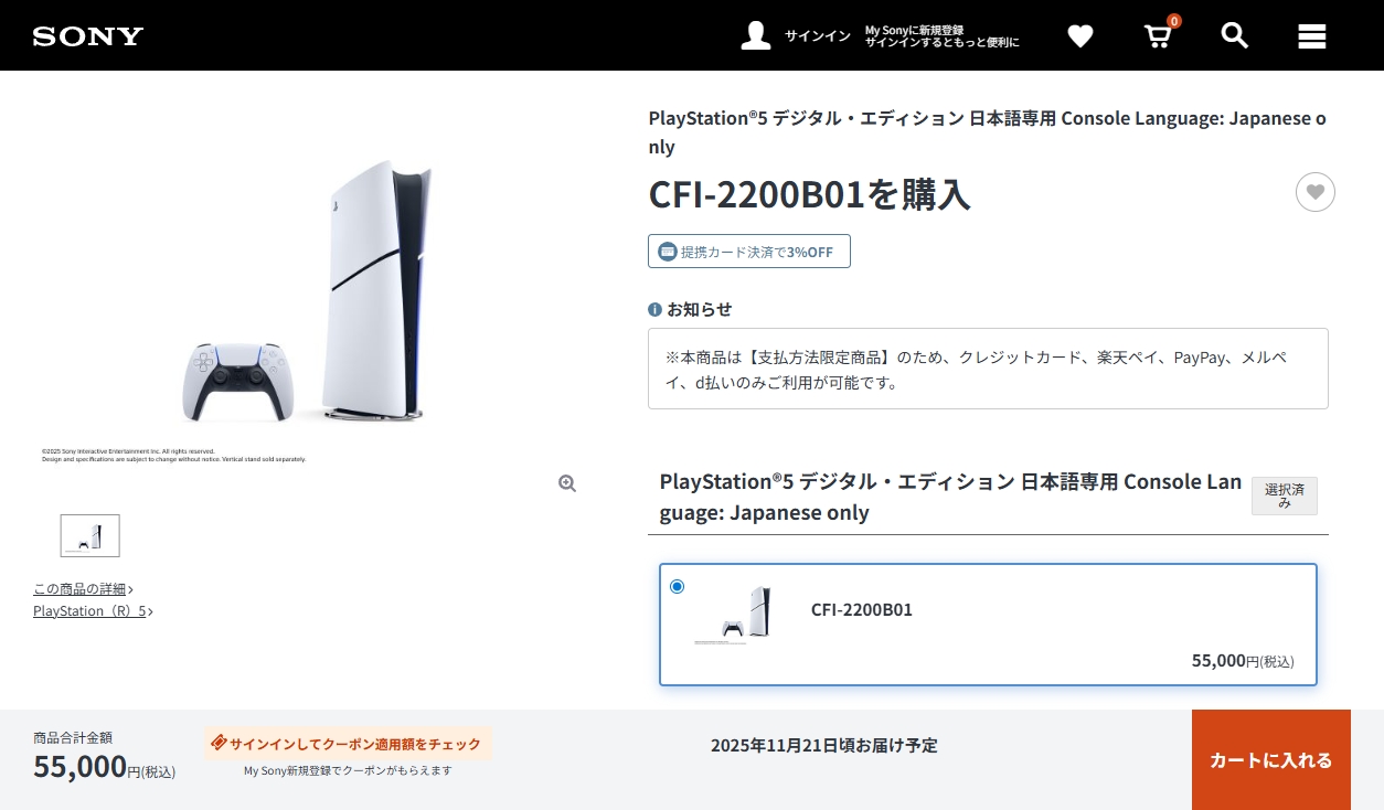 それが、PlayStation(R)5 デジタル・エディション 日本語専用 CFI-2200B01では「カートに入れる」という通常の仕様に解放された。