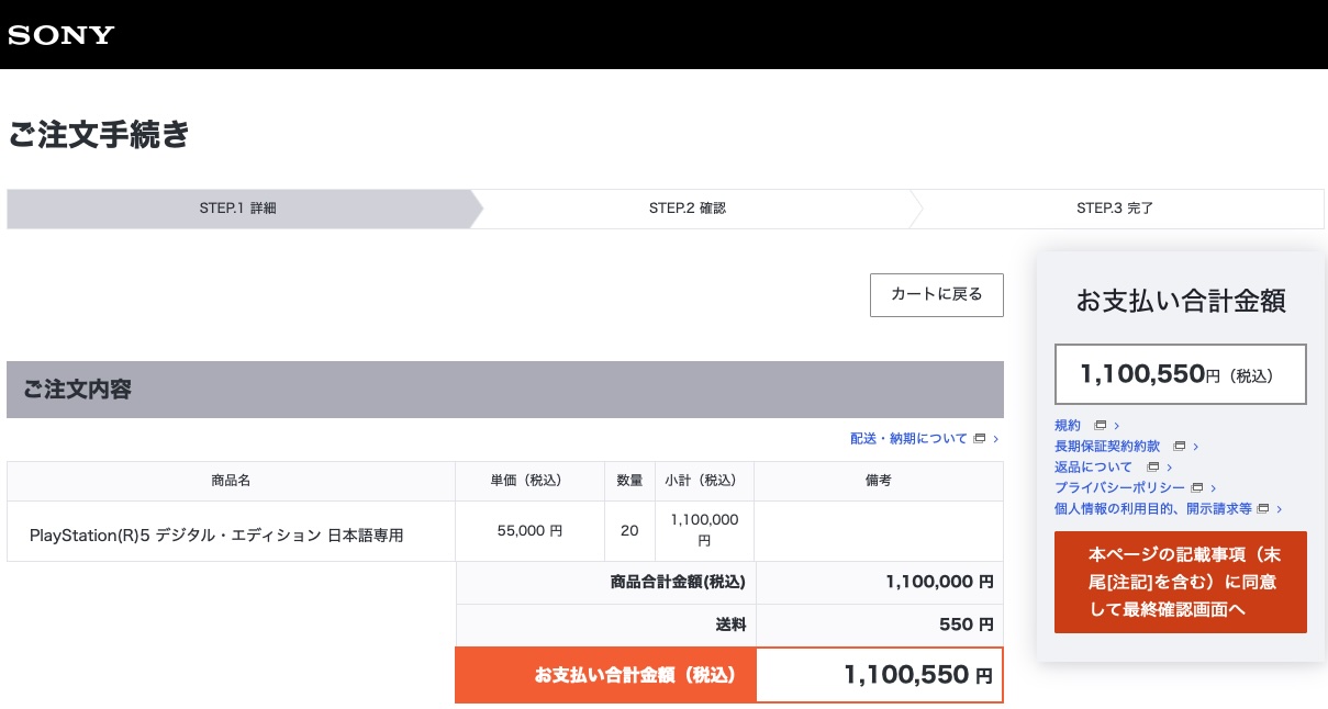 念の為20台購入できるとは言っても、ソニーストア側から転売行為と判断されれば注文のキャンセルやアカウントに何らかの制限がかかる可能性もあるので、常識の範囲で購入すべき。