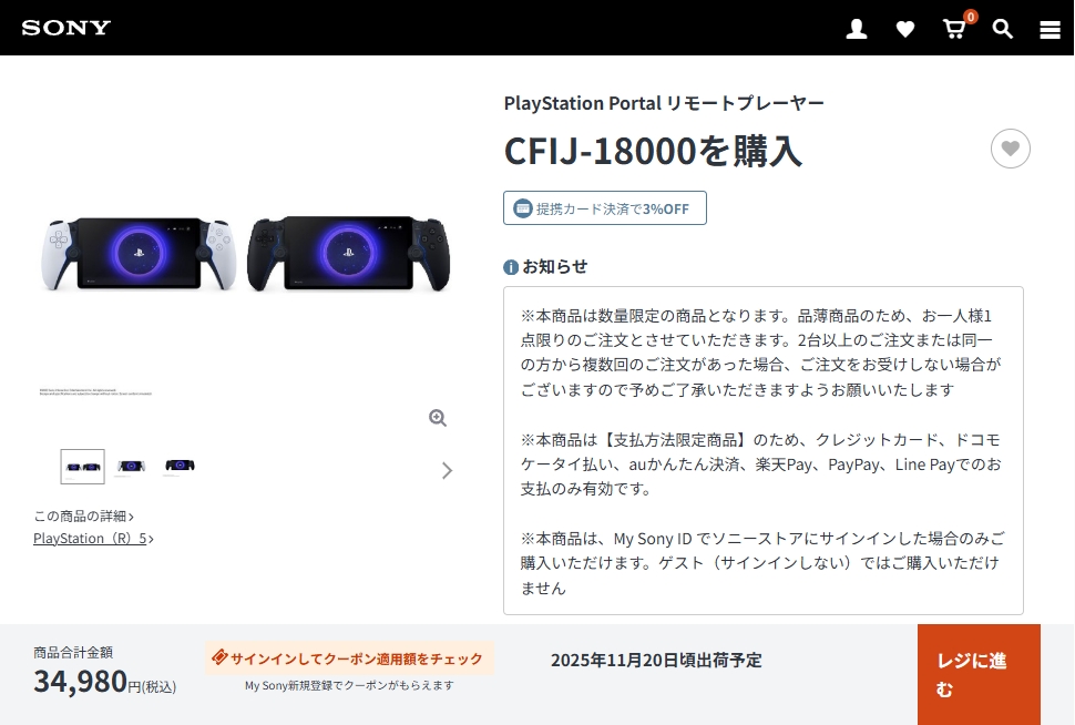 もちろんすべてのPS製品で制限がなくなったわけではなく、PlayStation Portal リモートプレーヤーやディスクドライブはこれまで同様「レジに進む」となっていて、単品購入しなければならない。