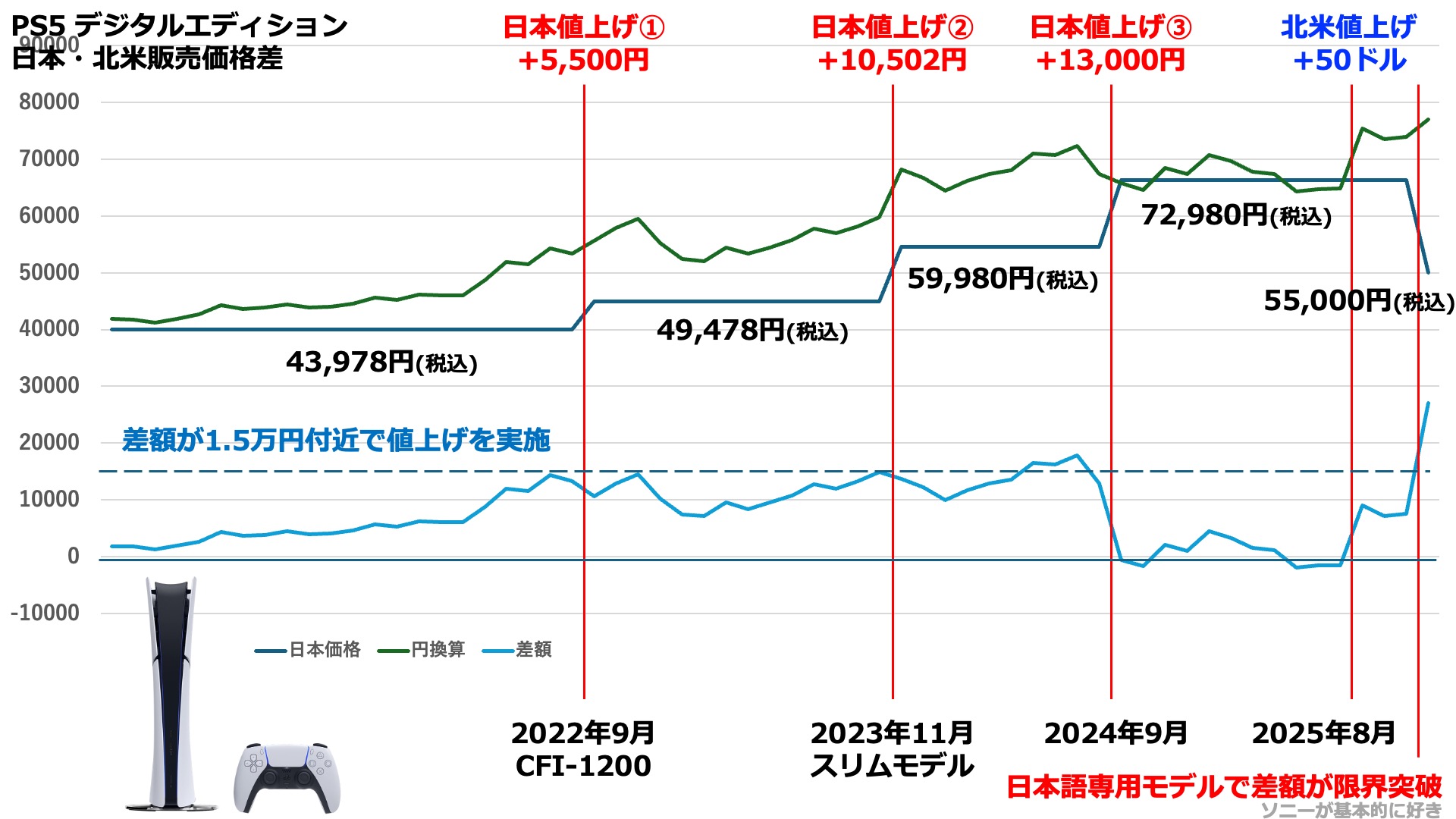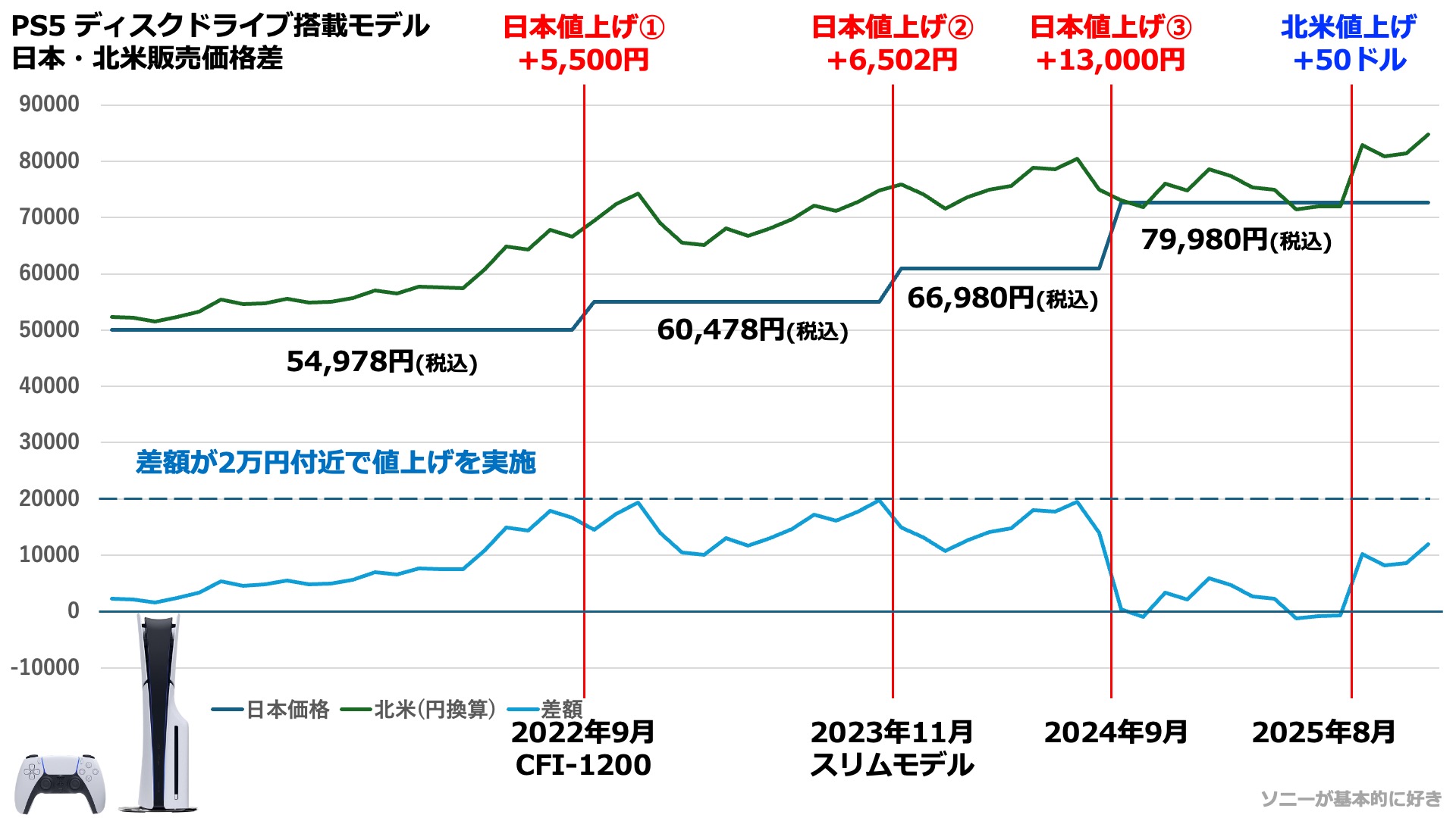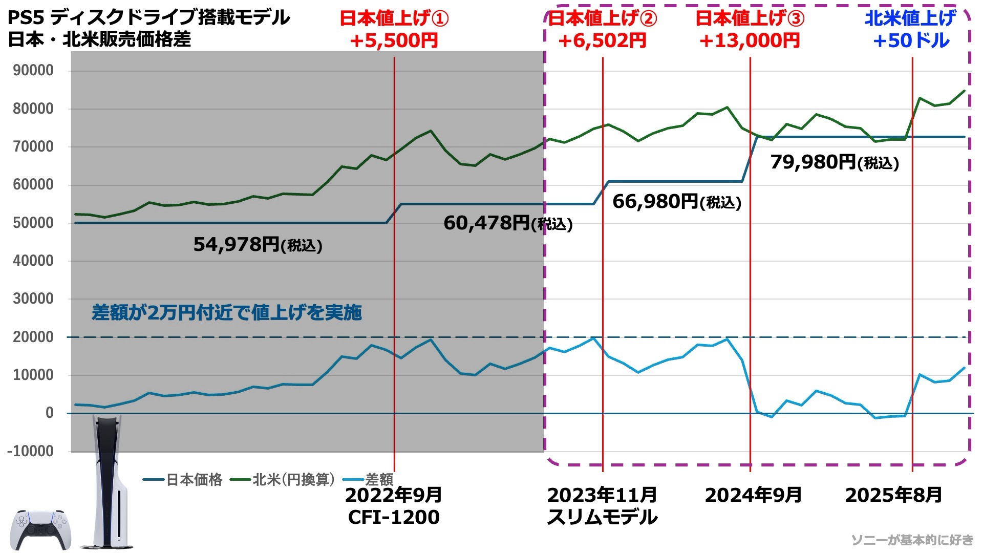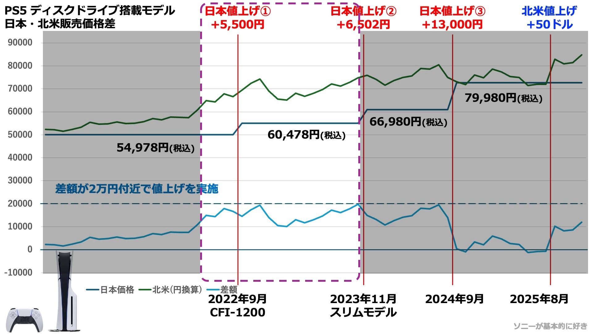 2025年8月には北米でもPS5通常モデルの価格を50ドル値上げしたことで、再び価格差が1万円を超えている。