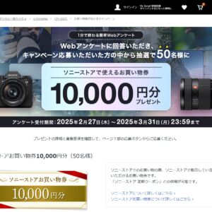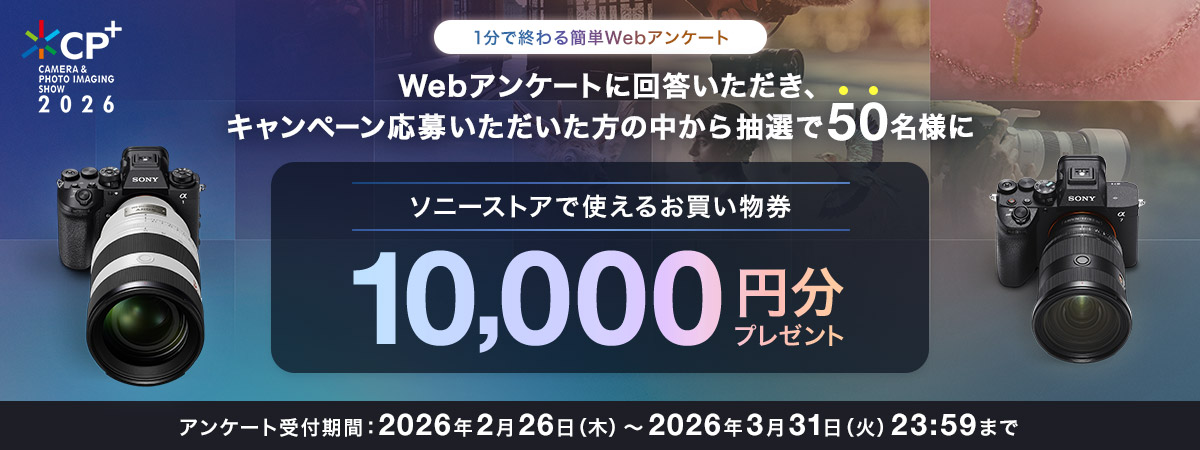 CP+2026の簡単Webアンケートに回答すると、ソニーストアで使えるお買い物券 10,000円が50名に当たるキャンペーン開始。2026年3月31日(火)まで。