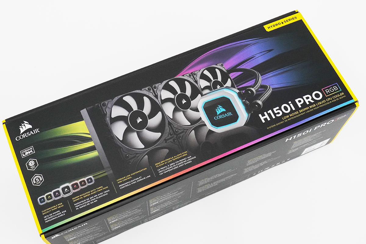「H150i PRO RGB CW-9060031-WW」の主な内容物は、プロセッサーを冷やす水冷ユニットからにょきにょきのびた水冷チューブでつながった360mmx120mmのラジエーターのメインパーツ。