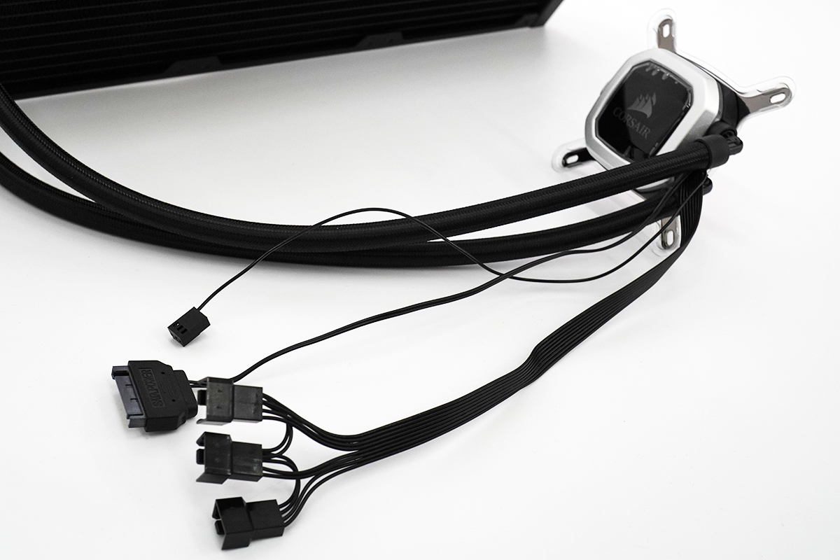 それ以外にのびているケーブルは、水冷ユニットに給電するためのSATA電源と、3基の冷却ファンにつながる4PIN、ポンプ回転数を出力する3PINファン、それぞれのケーブル。
